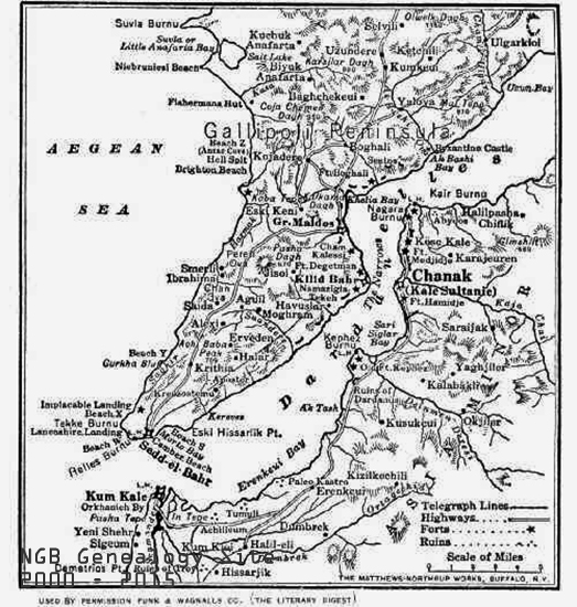 The various beaches where British, Australian and Newfoundland troops made landings on the west coast of the peninsula, are indicated as “Beach W,” “Beach X,” etc., running north to “Beach Z.” Points where some of the severest fighting took place, after the cliff on the shore had been surmounted were Drithia, Achi Baba, Gaba Tepe, and Anafarta. In the earlier operations with ships the Dardanelles were penetrated almost through the Narrows.