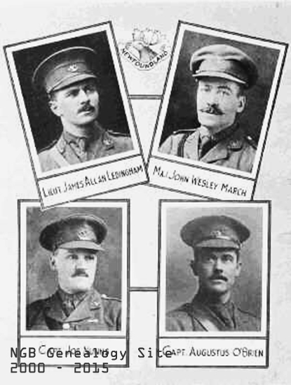 JOHN WESLEY MARCH Granted Commission, Captain, Sept. 21, 1914; British Mediterranean Expeditionary Force, Aug. 20, 1915; British Expeditionary Force, March 14, 1916; Awarded Military Cross, Dec. 11, 1916; Evacuated to Hospital, Jan. 20, 1917; Invalided to England, Jan. 21, 1917; Attached to Depot, Ayr, March 14, 1917; Decorated with Croix de Guerre, May 1, 1917; Major, July 1, 1917; Embarked for Newfoundland, May 22, 1919: Retired, July 5, 1919.