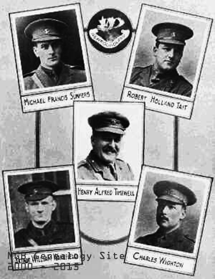 ROBERT HOLLAND TAIT Granted Commission, Lieutenant, Sep 24, 1914; British Mediterranean Expeditionary Force, Aug. 8, 1915; Admitted Hospital, Cairo, Sept. 8, 1915; Discharged from Hospital, Oct. 4, 1915; Embarked for Gallipoli, Oct. 19. 1915; Captain, Jan. 10, 1916; Admitted Hospital, Cairo, Feb. 28, 1916; Discharged to duty, April 30, 1916; British Expeditionary Force, ,May 16, 1916; Evacuated to Hospital, May 20, 1916; Discharged to duty, Oct. 19, 1916; Appointed Adjutant, May 23, 1917; Evacuated to Hospital, sick, July 17, 1917; Rejoined Battalion, Aug. 24, 1917 Awarded Military Cross, Oct. 9, 1917; Wounded, Neuve Eglise, April 12, 1918; Invalided to England, April 15, 1918; Embarked for Newfoundland on special duty, May 22, 1918; Appointed Acting Major, Jun 1. 1919, while commanding Discharge Depot, St. John's- Retired, Oct. 6, 1919. HENRY