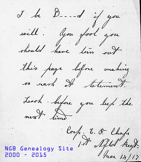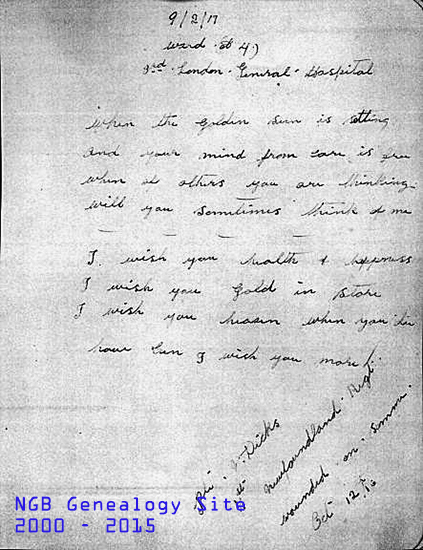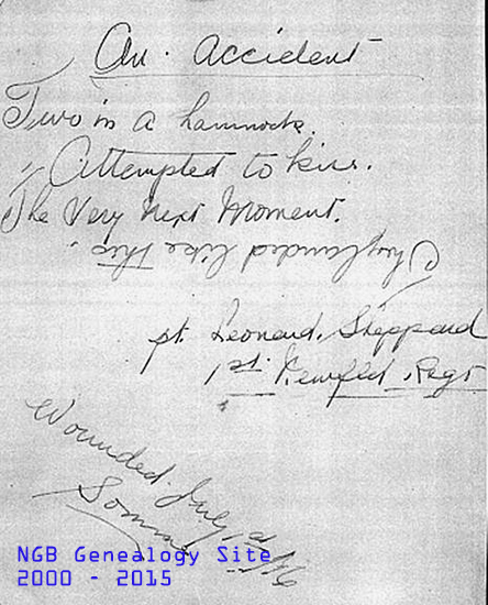 they had taken wounded soldiers from various battles. She took with her an autograph album which I now have as a treasured possession. There are entries written by Lance Corporal Leonard Sheppard, Private Dicks, Lance Corporal R.G. Chafe and Cpl E.F. Chafe. |
