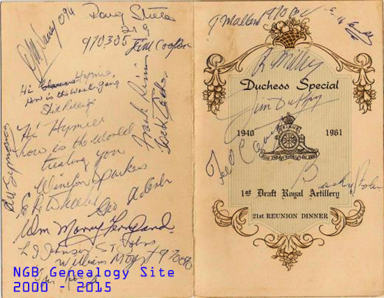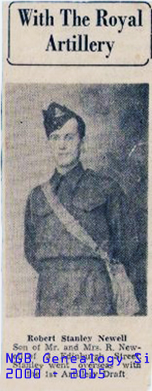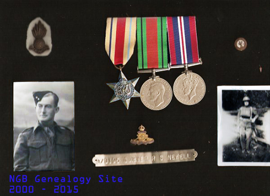 Robert Stanley Newell served with the 166th Royal Artillery along with his brother-in-law, James Reddy. The images below were donated by Heather Kelly [Daughter]. 1. Robert Newell [left] and brother, Richard [Royal Navy]2. Postcard 3. Back of Postcard 4. Group Photo ["arrow" points to Robert Newell ~ "X" points to Jack Martin ~ "0' points to Ches Stevenson] 5. Train Ticket 6. Back of Ticket 7. Robert Newell's dog tags 8. Reunion Photo 9. Fifth Row: 2nd from the right 10. Back of photo |