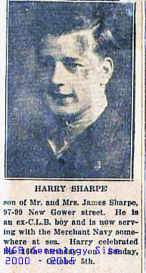 MY FATHER ..MY FRIEND Henry "Harry" Sharpe was born the fifth of October 1925 at 97-99 New Gower Street, St. John's, NL to parents James William Sharpe formally of Spoon Cove, CB and Alberta Lynch of Bishop's, CB. His parents operated James Sharpe & Sons General Store located at 97-99 New Gower Street. Harry attended the Anglican Cathedral & was a member of the Choir there and an enlisted member of the Church Lads Brigade in 1939. (See his attached certificate). Harry Sharpe was only 15 years of age when he stowed away on an American Convoy Ship. This young man wanted to be apart of the war effort like his other siblings: Ambrose Sharpe had enlisted in the Royal Newfoundland Regiment, Maxwell Sharpe & William John Sharpe both enlisted in the Merchant Navy, William James (adopted son of the Late Mark Sharpe) enlisted in the Royal Navy and was lost at sea aboard SS Burnham Royal Navy Ship on 25 Nov 1941, and his sister Jean Sharpe enlisted in the Canadian Army. & Harry Sharpe also enlisted in the Merchant Navy. . At the time of his 16th Birthday the picture below and announcement appeared in the local paper: