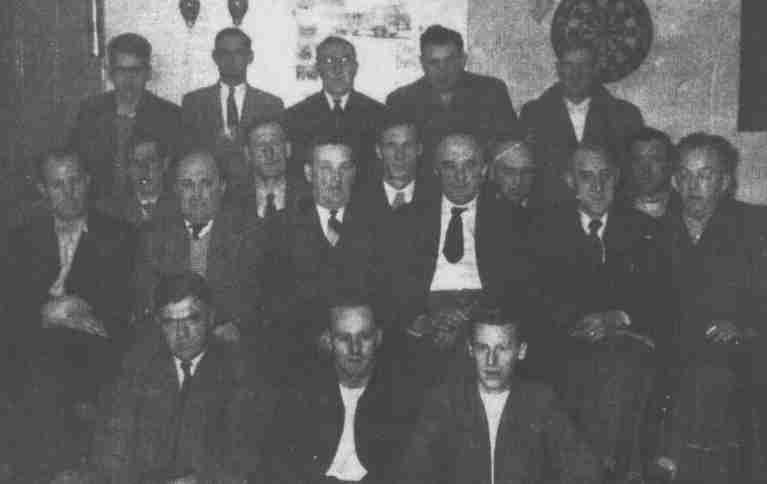 Pictured above are members of the Dominion Volunteer Fire Brigade. Left to right, front row: Len Hughes, Patrick Ezekiel, John Kennedy. 2nd row: Riv. Kennedy, Treasurer and Librarian; Harold Fillier, Recording Secretary; William Sullivan, President; Ben Blackmore, Senior Deputy Chief; Donald Gosse, Financial Secretary; William Cantwell, Driver. 3rd row: Charlie Morgan, Roy Meadus, Patrick Myers, William Fillier, Deputy Chief - West, Luke Roberts. Back row; William Vokey, Peter Costello, John Vokey, Norman Rees and Walter Vokey. Missing from the picture are: Robert Norman, Fire Chief and Inspector, James Murphy, Deputy Chief - East; George Rideout, Deputy Chief - Central; John Kitchen, Driver; Matt Farrell, Ben Farrell, Don Fillier, William Power, Martin Murphy, Riv Flynn, William Cahill, Gordon Bennett, Malcolm Blackmore, Ed Kennedy, Sam Nolan, Stan Keough, Arthur Blackmore, Wallace Harvey, Jim James, Wallace Vokey, and James Gushue.
