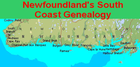 This is only a starting point for researching your family history along Newfoundlands southcoast, to include Burgeo - La Polie, Hermitage, Fortune Bay and Burin. In order for this to work I'll need input from you. I'll attempt to post materials here that may prove useful when they become available to me and time permits. If you have any questions please fell free to e-mail me using the "Contact" button at the bottom of the page and I'll see what I can do to aquire and post it. If you can provide information that would be appropriate please submit it and it will get posted. Contributer's will be given credit for their submissions.