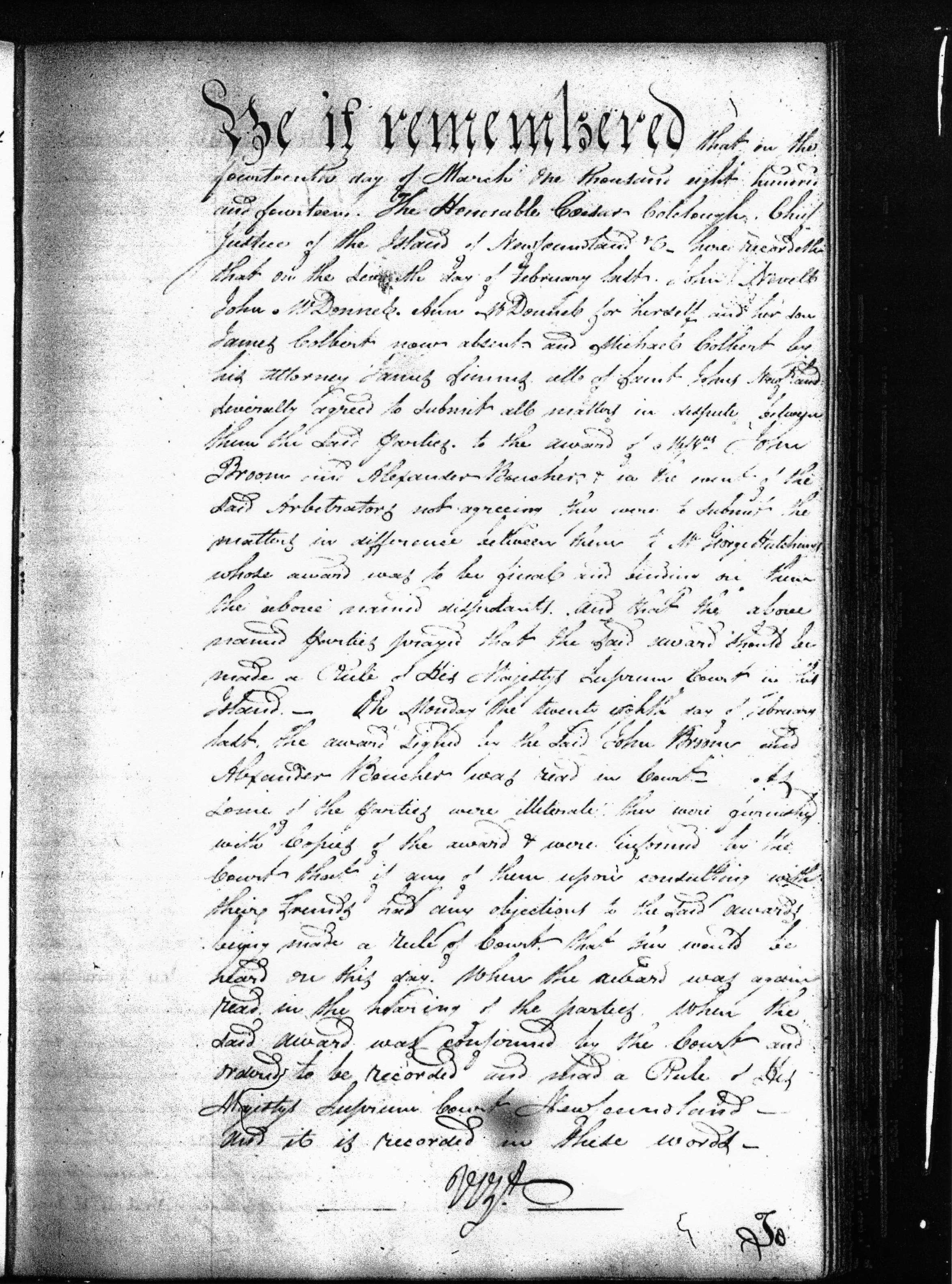 ??? Colebough, Chief Justice of the Island of Newfoundland &c. have recorded that on the seventh day of February ??? John Newell John McDonnell Ann McDonnell for herself and her son James Colbert now absent and Michael Colbert by his attorney James Simms all of Saint John's Newfoundland severally agreed to submit all ??? in separate ???? them the said ???? to the sum of ??? John Broom in Alexander Boucher in the event of the said arbitrator not agreeing they were to submit the matters in difference between them to Mr. George Hutchings whose award was to be final and ?? On them the above named defendants and that the above named parties pray that the said aware should be rendered (Rule of His Majesty Supreme Court in that Island. On Monday the twenty eighth day of February hath the award signed in the said John Broom and Alexander Boucher was read in Court. Some of the parties were illiterate were presented with copies of the award & were informed per the courts that if any of them upon consulting with their family had any objections to the said award being made a rule of court that ?? Would be heard on this day. When the award was again read in the hearing of the parties when the said award was confirmed by the Court and ordered to be recorded and made a rule of Her Majestys Supreme Court Newfoundland and it is recorded in these words.