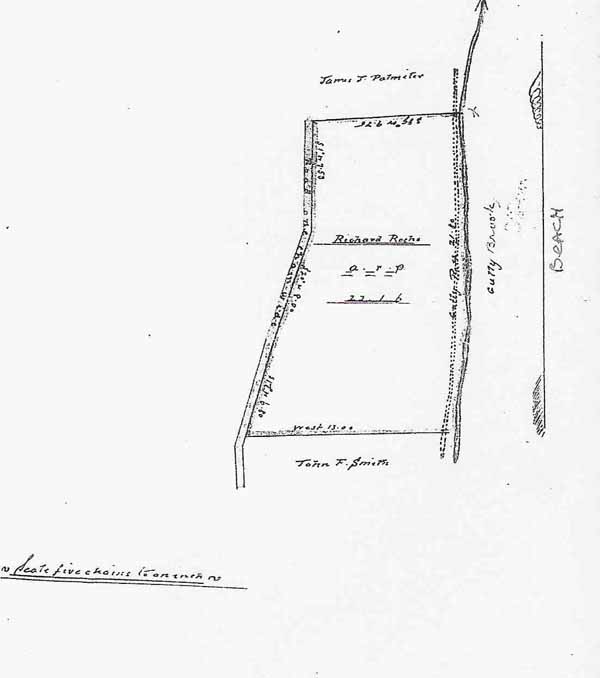 Vol. 33 Folio 116 Newfoundland 1887 Victoria, by the Grace of GOD, of the United Kingdom of Great Britain and Ireland, Queen, Defender of the Faith. To all to whom these presents shall come, Greeting: Know Ye, that We. Of Our Special Grace, Certain Knowledge, and Mere Motion, have given and granted, and by these presents do, for Ye, Our Heirs and Successors, Give and Grant unto Richard Roche of Topsail, Conception Bay in our Island of Newfoundland, Farmer, his Heirs and Assigns all that piece and parcel of Land situate and being at Topsail aforesaid abutted and bounded as follows, that is to say, by a line commencing at a point sixty-six feet distant from the bank or shore of the Gully being the south east angle of land in the possession of James J. Palmiter running thence by the same course eighty-nine degrees west nine chains and seventy-five links more or less thence by and at a distance of thirty-three feet from the centre of the Public Road south one degree west seven chains and fifty three links, south twenty degrees west eight chains and south seventeen degrees west six chains and eighty links more or less thence by land in the possession of J. F. Smith east thirteen chains more or less and thence by and at a distance of sixty-six feet from the shore of bank of the aforesaid Gully twenty-one chains and eighty links more or less to the place of commencement…. and being of the dimensions specified in the diagram delineated on the other side hereof and containing in one whole twenty-two acres, one road and six perches [rods = 5.5 yards] more or less with the appurtenances except and reserved nevertheless out of this present Grant to Us our heirs and Successors all Gold and Silver and Mines and minerals in or under said piece or parcel of Land To Have and to Hold (except as before excepted) unto the said Richard Roche under Section Twelve, Crown Lands Act 1884 as in margin [Every such Grant shall be upon the condition that the Grantee shall within five years from the date of the Grant bona fide clear and cultivate ten acres for every one hundred acres comprised in the Grant and in the same proportion for any less quantity.] his heirs and assigns for the said Richard Roche paying unto Us as the price and consideration of the said Land the SUM of Six Dollars and seventy-five cents at the time of the ensealing and delivery thereof. Provided always, and this present Grant is upon the further condition that the said Lands shall be holden upon, under and subject to such regulations as are now in force or which may at any time hereafter be made by Law for the improvement and cultivation of Lands within our said Island and subject to all such regulations as are now in force which may at any time hereafter be made by Law for making Roads, Sewers, Drains, Canals, Bridges or other public works or improvements within Our said Island or any part thereof and for subjecting any Lands therein situate or the owners or occupiers of such Lands to rates and assessments or other duties or services for the purposes aforesaid or for any of them. And that the said Richard Roche, his heirs and assigns shall at all times peaceably quit and deliver up possession to Us our heirs and successors of all such parts of the Land aforesaid as may be required for the purposes aforesaid or any of them upon receiving such compensation (if any) as by any Law now in force or hereafter to be made in that respect may be provided. Given under the Great Seal of the aforesaid Island of Newfoundland at St. John's in the said Island this seventeenth day of May in the Year of Our Lord One Thousand Eight Hundred and eighty-seven in the Fiftieth year of our Reign. Witness our trusty well-beloved Sir Frederick Carter, Knight Commander of the Most Distinguished Order of St. Michael and St. George, Administrator of the Government and Commander-in-Chief in and over our said Island and its Dependencies, etc. By His Excellency's Command Signed (by hand): M. Fenelon Received the day and year above written from the within named Grantee the Sum of Six dollars and seventy-five cents amount of Consideration Money of the land herein granted. $6.75 MAP of Property