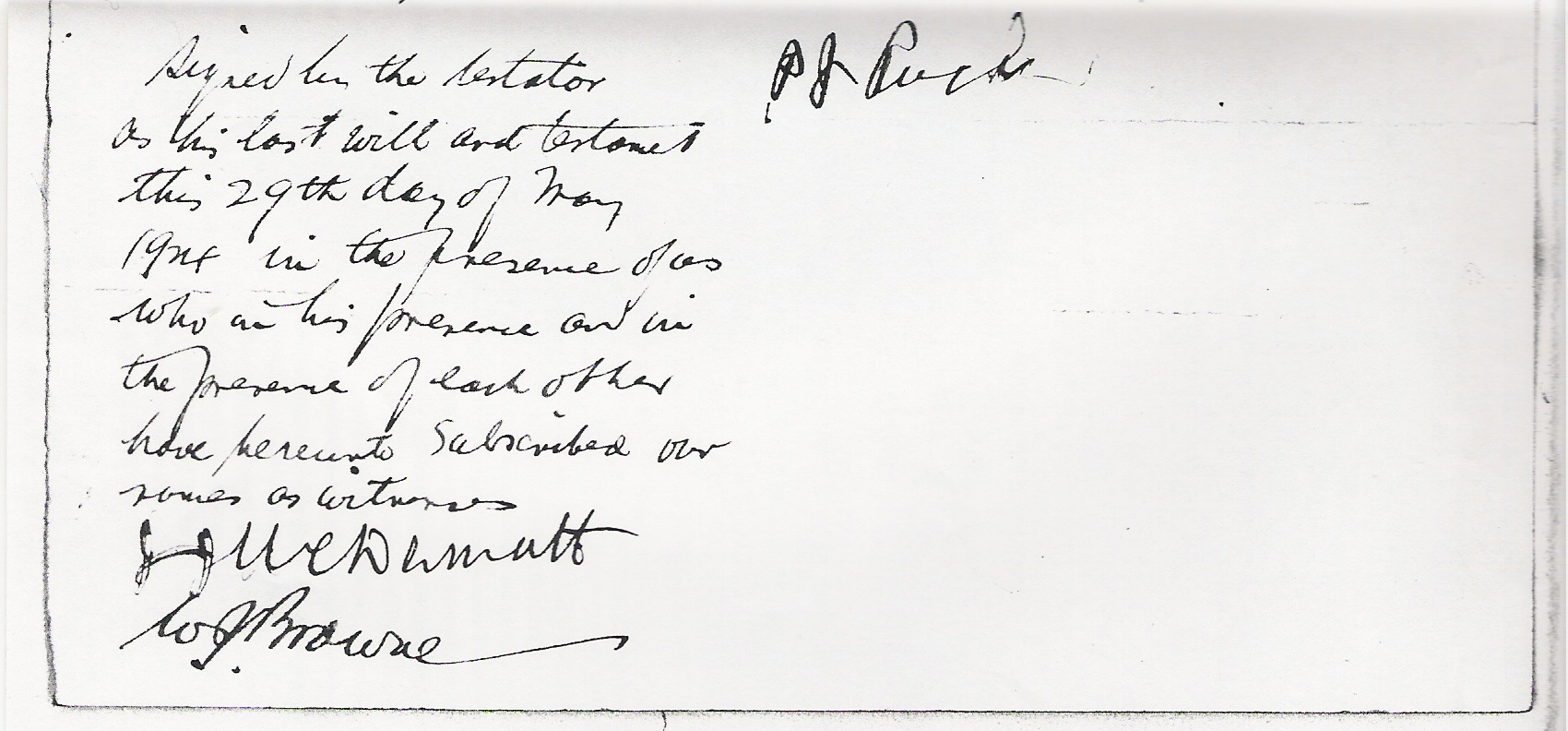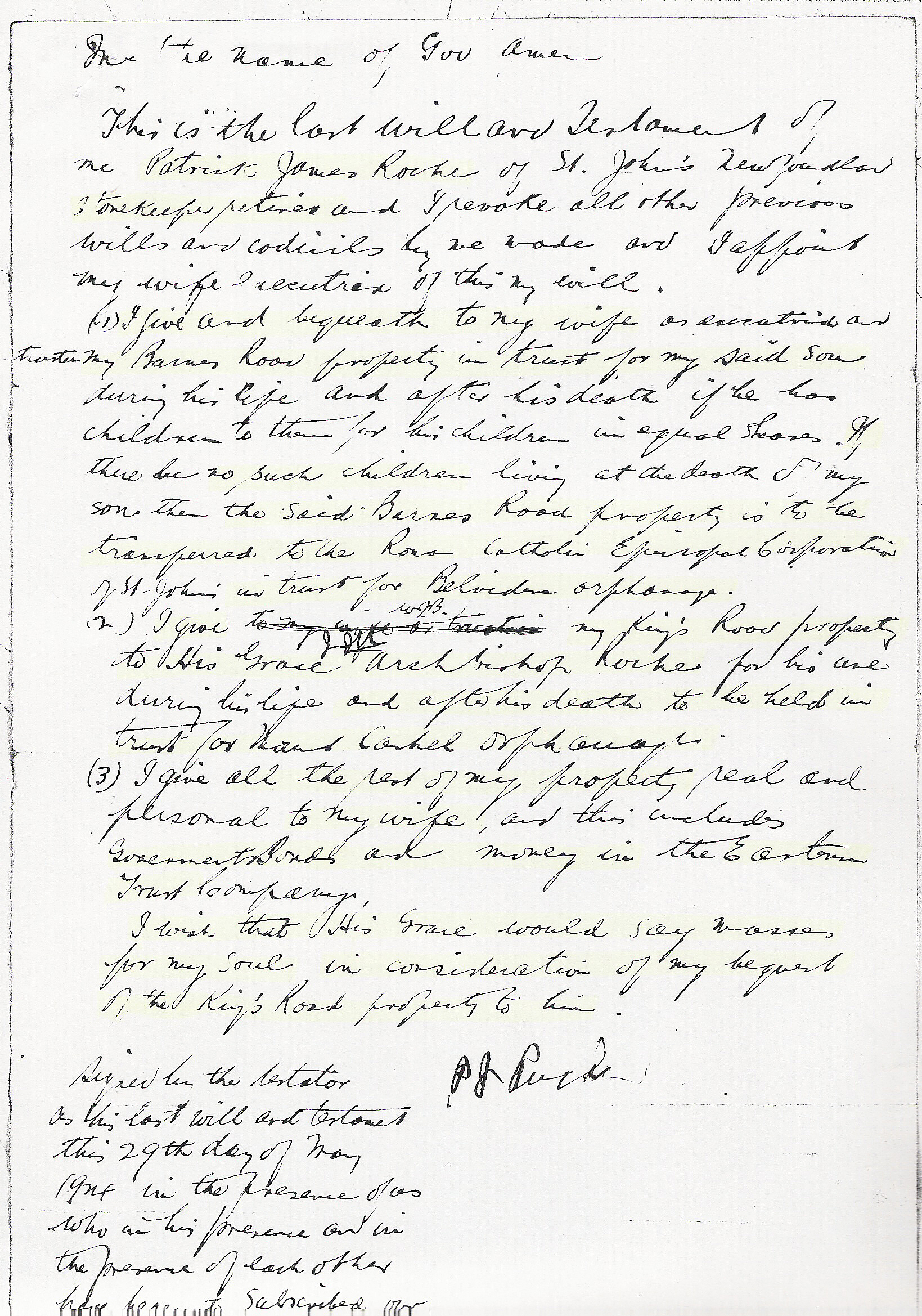 I wish that His Grace would say Masses for my soul in consideration of my bequest of the King's Road property to him. Signed by the Testator P.J. Roche J.J. McDermott Note: The Petition to the Supreme Court of Newfoundland or one of the Honourable Judges thereof by Solicitor W.J. Browne on behalf of Joanna Roche was dated 18 August 1924. It valued the Estate at $5820.00 and states that Patrick J. Roche died on or about 16 July 1924 survived by his wife and son John, no other next of kin.