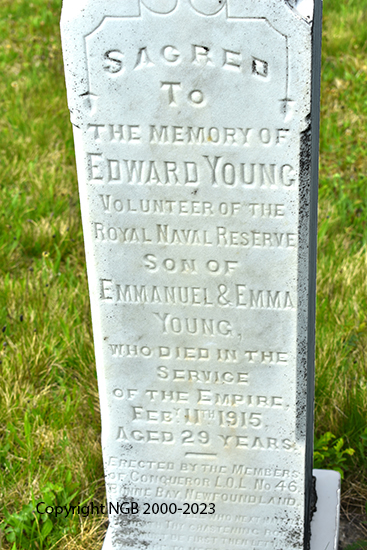 | YOUNG # | Edward | Feb 11, 1915 | 29 | Volunteer of the Royal Naval Reserve Who Died in the Service of the Empire Feb 11, 1915. Son of Emmanuel & Emma Young |