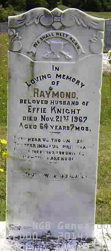 In Loving memory of Raymond beloved husband of Effie Knight died Nov 21st 1967 Aged 64 years 7 mos. Ever near us tho unseen Thy dear immortal spirit treads For all the boundless universe Is life - there are no dead Erected by wife and family |