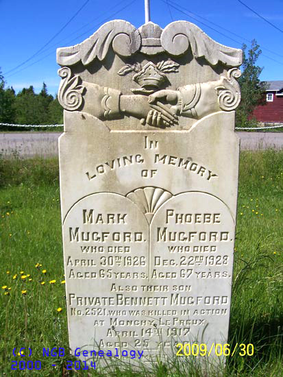 | MARK MUGFORD Died: April 30th 1926 Aged: 65 Years PHOEBE MUGFORD Died: Dec 22nd 1928 Aged: 67 Years Also Their Son PRIVATE BENNETT MUGFORD Number 2521 Died: April 14th 1917 Aged: 25 Years |