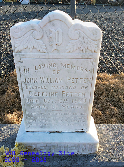 | JOHN WILLIAM PETTEN Died: Oct 6th 1940 Aged: 61 Years Beloved Husband of Caroline Petten |