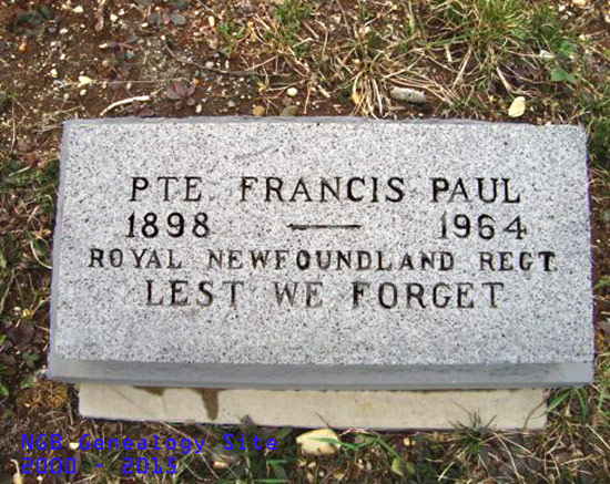 | Pte Francis Paul 1898 ~ 1964 Royal Newfoundland Regiment ~ Lest We Forget Badger Catholic Cemetery |