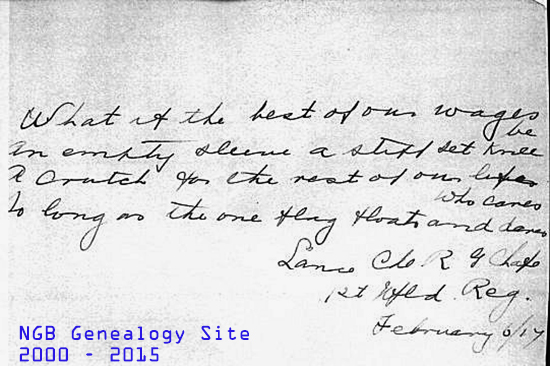 they had taken wounded soldiers from various battles. She took with her an autograph album which I now have as a treasured possession. There are entries written by Lance Corporal Leonard Sheppard, Private Dicks, Lance Corporal R.G. Chafe and Cpl E.F. Chafe. |